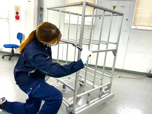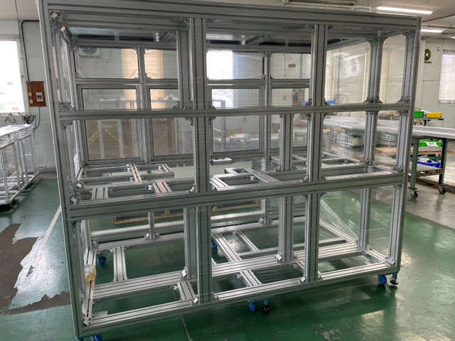 アルミ 業界 No1 メーカー様から、装置架台・作業台・シューター・安全柵・クリーンブースや、作業負担を軽減するからくりの機構を用いた製品の組立を受託しております。
